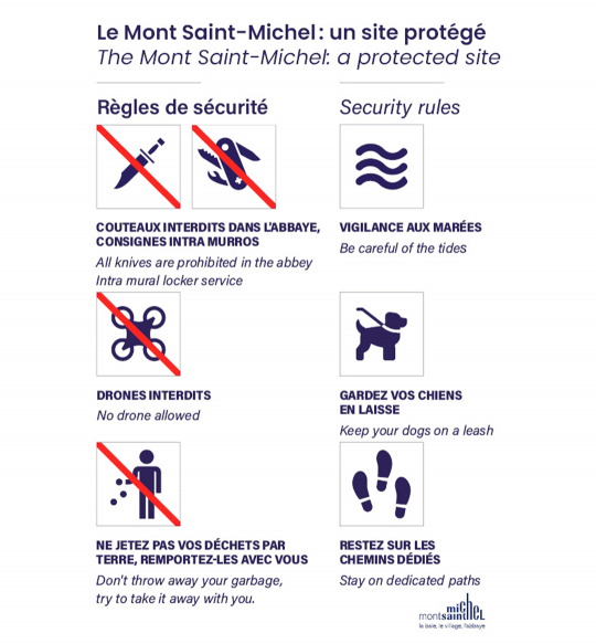 Le Mont Saint-Michel est un site protégé, inscrit au patrimoine mondial de l’UNESCO, pour contribuer à la préservation du site, les visiteurs sont priés de respecter ces quelques règles pour profiter au mieux de leur expérience sur le site.